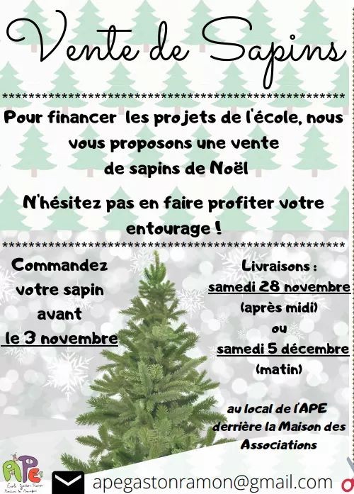 Revenir aux événements APE ÉCOLE GASTON RAMON 24.10 Vente de sapins Afin d'apporter une aide financière sur certains projets de l'école publique Gaston RAMON, L'Association des Parents d'Élèves propose une vente de sapin de Noël